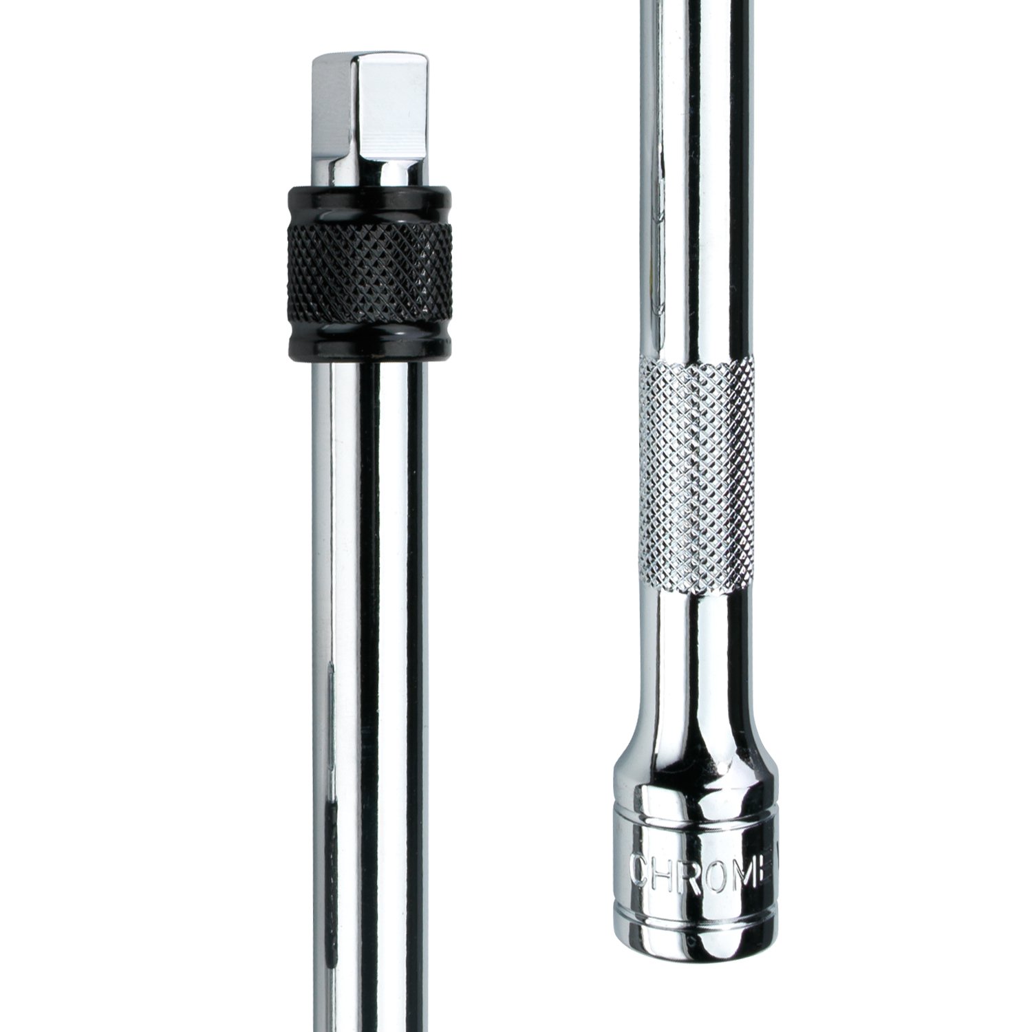It’s a drag when you pull your ratchet and extension bar out of a tight spot only to discover that the socket is still stuck on the bolt head. That’ll never happen if you use locking extension bars. Pull back the locking ring, snap on a socket and let go. The socket is locked on and will always come out with the extension bar. |